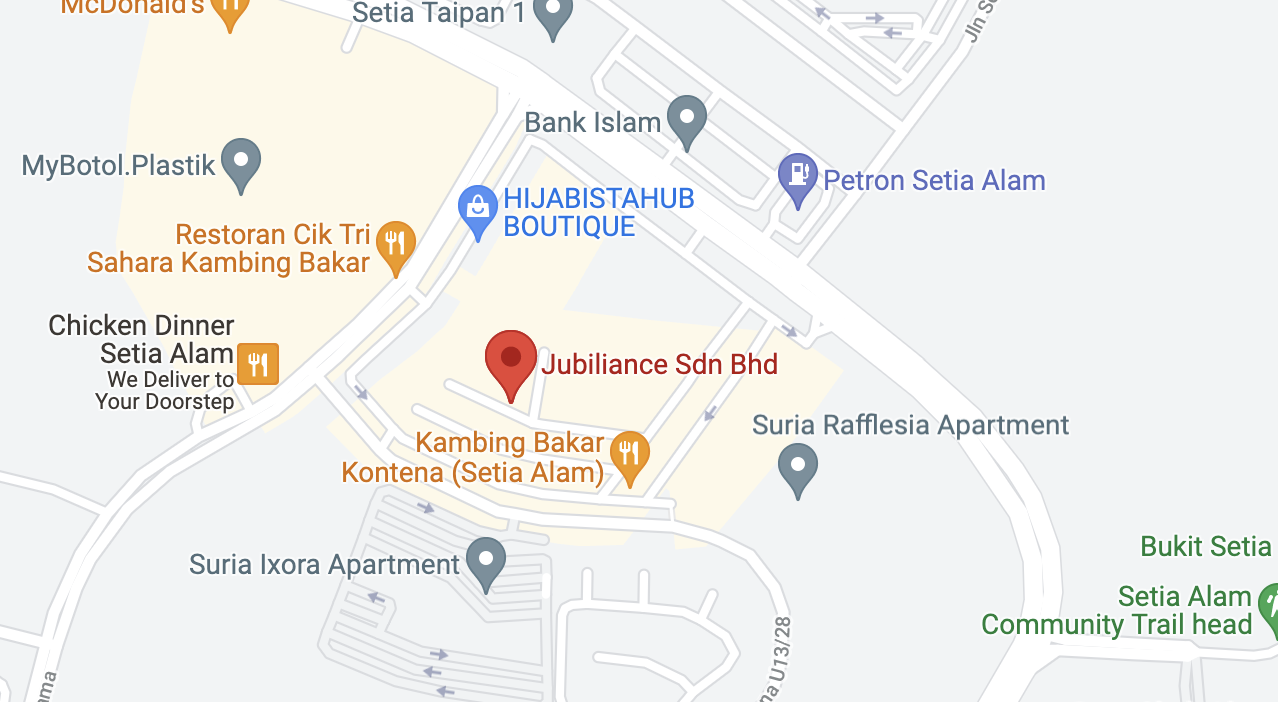 Get In Touch Contact Call Us 03-58858542 Email Us hello@jubiliance.com.my Visit Us No.38, 3F, Jalan Setia Perdana BE U13/BE, Alam Nusantara, 40170 Shah Alam, Selangor Message Us Name Email Address Message Submit